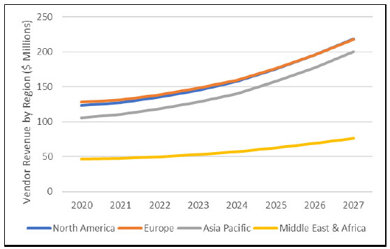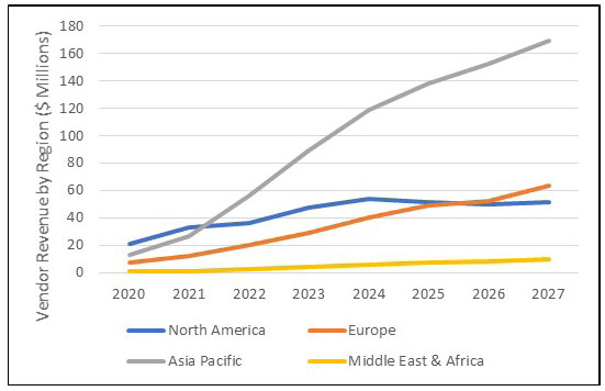 這兩個市場研究之間的差異與供應商收入基礎的差異以及對增長領域的不同假設有關。圖60在其收入預測中包括了維護費用,并假設所有地區(qū)的增長率都非常相似。圖61預測了亞太地區(qū)(尤其是日本、澳大利亞、韓國、中國和印度)的高速增長,并且只包括供應商收入的新部署。
