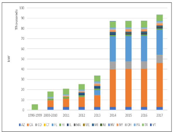 2017年,美國目前部署的熱儲能(TES)設施的裝機容量接近100MW。除了2014年的部署大幅躍升之外,但之后的增長很緩慢。美國部署的熱儲能(TES)設施最多的地區(qū)是紐約州和賓夕法尼亞州。