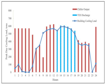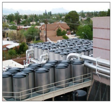 熱儲能(TES)是一項成熟的儲能技術,可以將供熱或制冷能量從電力價格較高的峰值需求期間轉移到電力價格較低的非峰值期間。冰基或冷凍水這兩種類型的熱儲能系統(tǒng)可以按需求改變夜間供應。本報告只考慮了冰基熱儲能系統(tǒng)。圖56提供了一個典型的熱儲能周期。圖57顯示了亞利桑那大學的商業(yè)熱儲能系統(tǒng)。