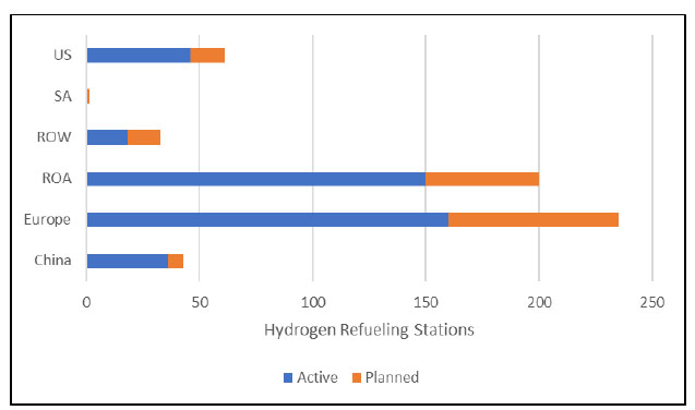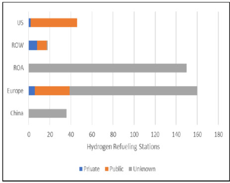 在全球范圍內,目前只有400多個加氫站,計劃再增加170個。歐洲和亞洲(不包括中國)擁有最多的加氫站(300個以上),并且計劃建設約150個。盡管尚不了解大多數(shù)公共/私有基礎設施,但很大一部分是公共加氫站點。圖54和55匯總了全球加氫站的數(shù)量。