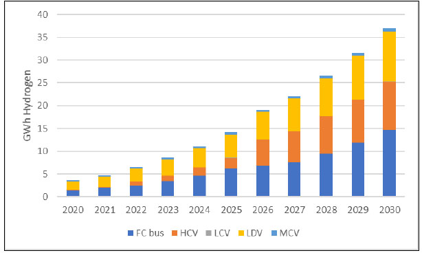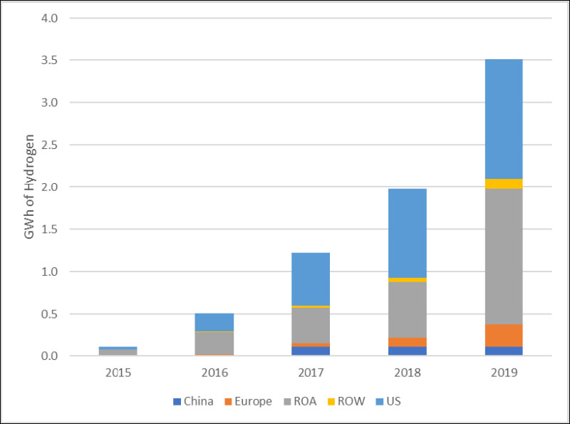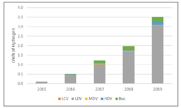 美國、日本和韓國是燃料電池(FCEV)部署的領導者。部署的大多數(shù)燃料電池(FCEV)都用于輕型車輛,但最近(尤其是在中國),燃料電池公共汽車的重要性開始增強。使用燃料電池汽車銷售量和每種車輛類別的代表性的車載儲氫量,以及氫的熱值(LHV),并估算了燃料電池汽車中作為儲氫的累積能量,如圖50和圖51所示。