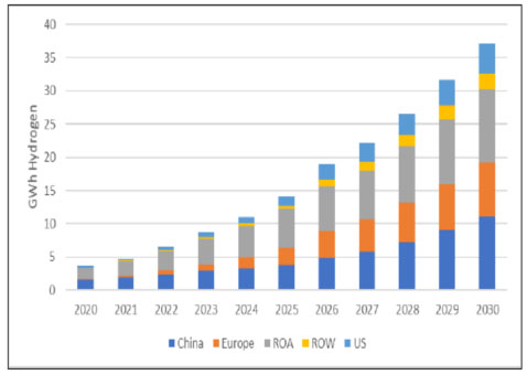 根據(jù)彭博社新能源財經(jīng)公司對于燃料電池電動汽車的預測,圖52和53顯示了到2030年的預計部署量。到2030年,每年可以部署超過35GWh車載儲氫量。預計中國和亞洲其他國家將部署最多的車載儲氫量,而歐洲緊隨其后。燃料電池客車和輕型客車燃料電池電動汽車預計對車載儲氫有著更大需求。