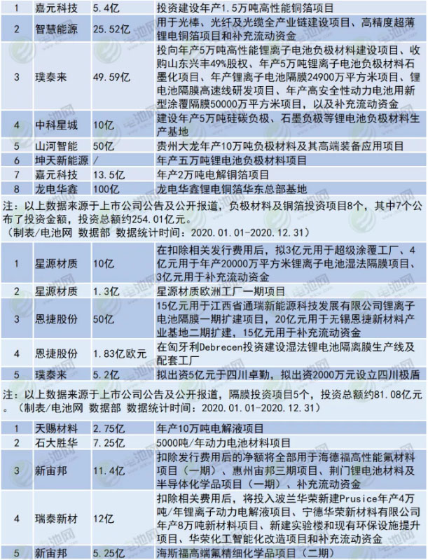 其中,2020年,動(dòng)力電池頭部企業(yè)寧德時(shí)代擴(kuò)產(chǎn)力度超預(yù)期:2月公告新增車?yán)餅?00億約45GWh投資項(xiàng)目,8月公告與浙江吉潤(rùn)合資“時(shí)代吉利”投資80億元?jiǎng)恿﹄姵仨?xiàng)目;12月更是連發(fā)3條投資擴(kuò)產(chǎn)投資公告,擬總投資390億建設(shè)/擴(kuò)建三大基地。