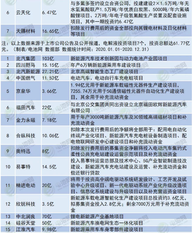 根據(jù)上市公司公告及公開報(bào)道,電池網(wǎng)統(tǒng)計(jì)了2020年電池新能源產(chǎn)業(yè)鏈投資擴(kuò)產(chǎn)項(xiàng)目相關(guān)情況,統(tǒng)計(jì)在內(nèi)的103個(gè)項(xiàng)目,97個(gè)公布投資金額,投資總額逾3737.52億元。其中,鋰電池投資項(xiàng)目28個(gè),26個(gè)公布了投資金額,投資總額逾1820.23億元;正極材料、上游原材料及鋁箔投資項(xiàng)目15個(gè),13個(gè)公布了投資金額,投資總額逾296.34億元;負(fù)極材料及銅箔投資項(xiàng)目8個(gè),其中7個(gè)公布了投資金額,投資總額約254.01億元;隔膜投資項(xiàng)目5個(gè),投資總額約81.08億元;電解液投資項(xiàng)目7個(gè),投資總額達(dá)61.77億元;新能源汽車、零部件、充換電領(lǐng)域投資項(xiàng)目24個(gè),總額達(dá)909.52億元;氫能領(lǐng)域投資項(xiàng)目7個(gè),其中6個(gè)公布了投資金額,投資總額逾222.75億元;鋰電設(shè)備及其他領(lǐng)域投資項(xiàng)目9個(gè),投資總額逾91.82億元。