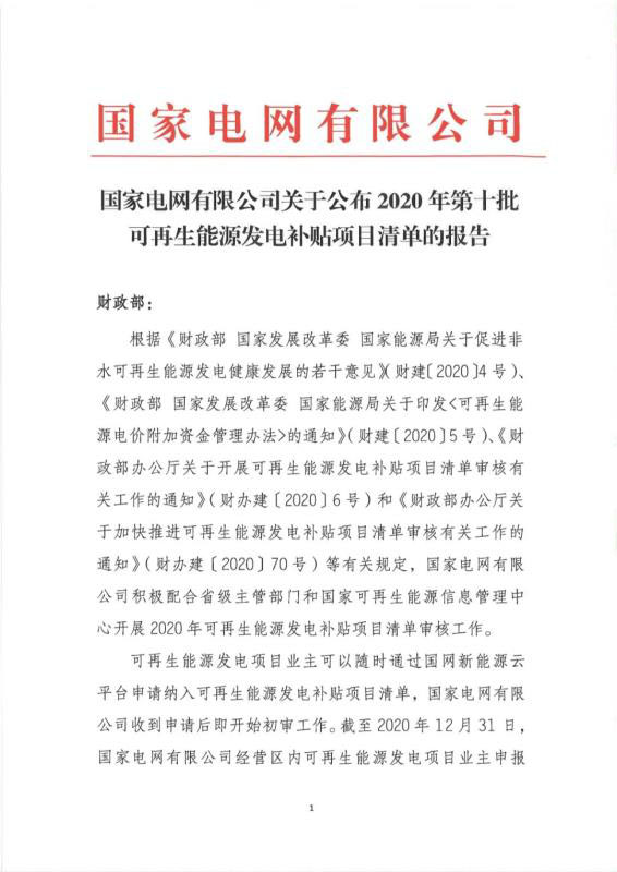 根據(jù)《財政部 國家發(fā)展改革委 國家能源局關于促進非水可再生能源發(fā)電健康發(fā)展的若干意見》(財建〔2020〕4號)、《財政部 國家發(fā)展改革委 國家能源局關于印發(fā)<可再生能源電價附加資金管理辦法>的通知》(財建〔2020〕5號)、《財政部辦公廳關于開展可再生能源發(fā)電補貼項目清單審核有關工作的通知》(財辦建〔2020〕6號)和《財政部辦公廳關于加快推進可再生能源發(fā)電補貼項目清單審核有關工作的通知》(財辦建〔2020〕70號)規(guī)定,國家電網(wǎng)有限公司積極配合各省級能源主管部門和國家可再生能源信息管理中心,為符合中央財政補助條件的可再生能源發(fā)電項目提供補貼清單申報服務。