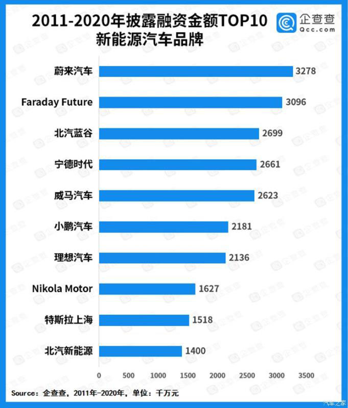 從新能源汽車品牌的融資總金額來看,蔚來汽車以327.8億元摘得魁首,F(xiàn)araday Future(法拉第未來)以309.6億元位居第二,北汽藍谷以269.9億元位居第三。此外,入圍融資金額TOP10的新能源汽車相關(guān)品牌還有寧德時代、威馬汽車、小鵬汽車、理想汽車等。