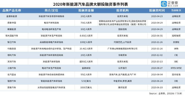 2020年,在傳統(tǒng)車市遇冷的大背景下,新能源汽車繼續(xù)保持增長的態(tài)勢。依照最新數(shù)據(jù)顯示,2020年1-11月,全國乘用車市場累計零售量同比下降8.3%,但同時期的新能源汽車銷量卻同比增長了3.9%。從融資事件數(shù)和披露的金額來看,2020年新能源汽車品牌融資事件數(shù)比去年下降了18.3%,但披露的融資金額同比大漲159.4%,達到1292.1億元,近十年來首次突破千億。