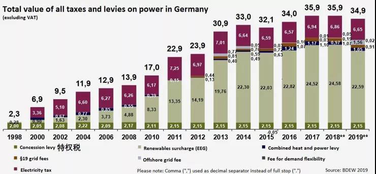 雖然德國的可再生能源發(fā)電發(fā)展迅速,但這也是有代價的。政府通過補(bǔ)貼使廉價的可再生能源在電力市場中優(yōu)先競價出清,從而壓低了現(xiàn)貨市場的電價。對于部分在批發(fā)市場中直接購電的高能耗大型工廠來說,這減少了他們的電費支出,使其受益。然而,對于無法以批發(fā)價在現(xiàn)貨市場購電的家庭或小型企業(yè)來說,大量可再生能源實際上推高了他們的電價。這是因為政府實際上是通過在終端居民賬單中加征可再生能源稅,網(wǎng)絡(luò)費用等來向風(fēng)電場和光伏電站提供資金補(bǔ)貼,這些費用甚至能占到總電價的三分之二。下圖說明了近20年來德國電價和各種稅收的增長。