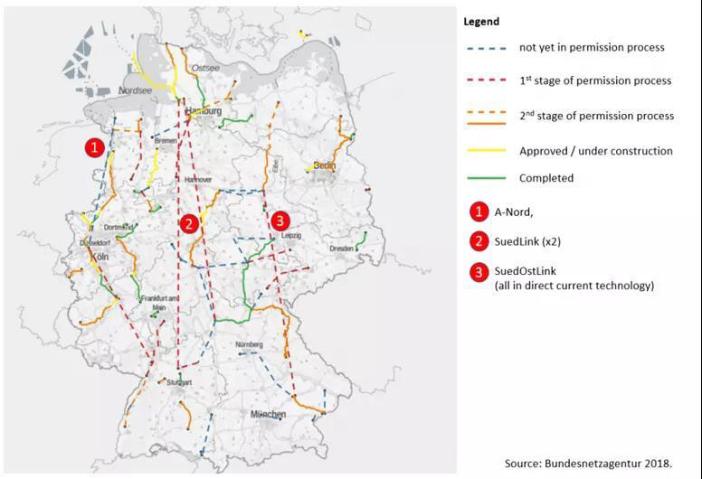 對此,德國政府和電網(wǎng)運營商已經(jīng)開始加快建設(shè)更多的南北輸電線,見上圖。根據(jù)聯(lián)邦網(wǎng)絡(luò)局的數(shù)據(jù),2025年之前,預(yù)計將有4650公里的新電線建成,另有約3050公里的電力線被翻新。雖然鋪設(shè)新線路涉及到土地,居民等方方面面的協(xié)調(diào)管理,但若不加快輸電線的建設(shè)以減少南北能源消費和生產(chǎn)的不平衡情況,這一問題可能會成為德國當(dāng)前目標(biāo)達(dá)成的向100%可再生能源發(fā)電的最大阻礙因素。