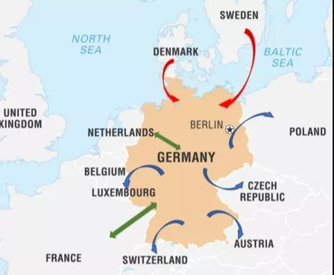 在地圖上顯示各國與德國的進(jìn)出口關(guān)系如下。