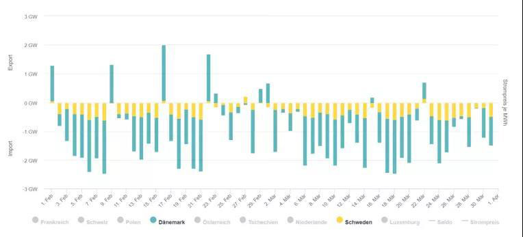 二月的電力出口明顯多于九月,最多的一天(2月9日晨間)出口量達(dá)14.94GW,而當(dāng)時德國總負(fù)荷量也僅為41.10GW,其中可再生能源占72%,也就是說雖然有近半數(shù)的風(fēng),光,水力發(fā)電并沒有被消納,但卻靈活地出口到了其他國家。2月27日傍晚17:30,太陽接近下山后光伏幾乎無出力,風(fēng)力發(fā)電也僅有5.95GW,幾乎是整個2月的最低。為應(yīng)對可再生能源的低出力,硬煤和褐煤電廠分別提升至了本月最高出力的80%和72%,燃?xì)怆娬緞t提升至本月最高出力的93%。在仍無法滿足全部負(fù)荷的情況下,德國從鄰國電網(wǎng)中進(jìn)口了8.47GW電力,成功保障了電力供應(yīng)安全。