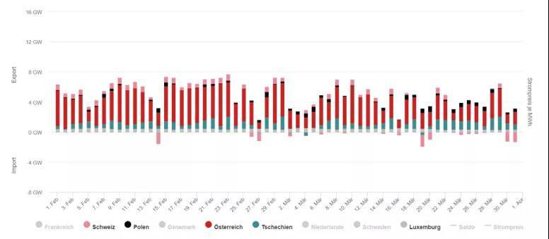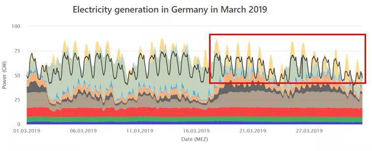 三月太陽能發(fā)電量開始逐漸變高,風(fēng)電則開始減少。值得注意的是,三月下旬受新冠疫情的影響,全德經(jīng)濟(jì)活動受到一定抑制,總負(fù)荷曲線開始整體下調(diào)。3月22日正午12:30時,在負(fù)荷僅有53.13GW的情況下,僅光伏發(fā)電便達(dá)到了33.41GW,風(fēng)電則為20. 73GW。雖然由于基礎(chǔ)負(fù)荷無法繼續(xù)向下調(diào)節(jié)容量以消納所有風(fēng)光發(fā)電,因此存在一部分電力出口,但該時段可再生能源發(fā)電量達(dá)到了總用電消費的83.7%。