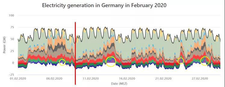 以2020年2月10~16日的一周為例,該時段內(nèi)德國風(fēng)電產(chǎn)量非常高,峰值可達(dá)45.48GW。因此,燃?xì)獍l(fā)電,燃煤發(fā)電,甚至核電都在相應(yīng)調(diào)節(jié)出力。例如,2月16日周日午間13:00,德國總電力負(fù)荷量為54.38GW,相對工作日同一時間的負(fù)荷較少。由于正值正午,光電出力為8.59GW,而風(fēng)力發(fā)電則達(dá)到了39.63GW。為消納這部分可再生能源發(fā)電,燃?xì)怆姀S在該時段壓至當(dāng)周最高出力的15.4%,硬煤電廠和褐煤電廠則分別壓至當(dāng)周最高出力的19.5%和35.4%。核電廠相對本周最高出力也減少了約35%。