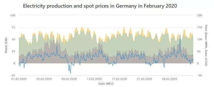 二月光照依然不充沛,但風(fēng)力發(fā)電量卻顯著上升,在2月22日達(dá)到了峰值46.88GW的發(fā)電量。2月1號是周六,因此第一天的負(fù)荷量就相對較低。整體看來,工作日與周末的總負(fù)荷明顯不同,這樣的需求側(cè)與電源側(cè)均為高波動性情況下,德國高比例新能源電力系統(tǒng)如何打破能源不可能三角,長期維持電網(wǎng)安全穩(wěn)定運行、高可靠性和低棄電率,值得深度分析研究。
