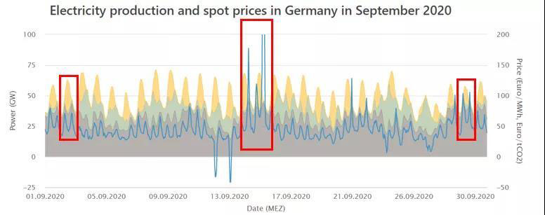 圖中的藍(lán)色曲線代表每日的電價(右y軸),黃色和綠色色塊分別代表光伏、風(fēng)電出力,淺棕色色塊則是化石能源與核能(以下統(tǒng)稱常規(guī)能源)的發(fā)電量??梢钥闯觯旁码m然風(fēng)電出力較小,但光照資源較為優(yōu)越,因此電價曲線在一天內(nèi)有非常明顯的峰谷差,最高位和最低位現(xiàn)貨市場出清價格平均相差約20~30歐元/MWh–正午光電出力最高時電價非常低,早晚風(fēng)光發(fā)電都較弱時電價又會暴漲。燃煤、燃?xì)鈾C(jī)組的出力曲線因此與電價曲線的形狀十分相似,且能看出電價曲線一般會略先于基礎(chǔ)能源發(fā)電曲線,說明現(xiàn)貨市場的價格變化有效激勵了這些常規(guī)電源的靈活出力和調(diào)峰。9月12~13日的周末,由于整體負(fù)荷較低,光伏出力又比較高,現(xiàn)貨市場甚至還出現(xiàn)了負(fù)電價。這是可再生能源大發(fā)情況下常出現(xiàn)的一種現(xiàn)象,意味著當(dāng)常規(guī)電源壓至最低出力仍不能消納所有可再生能源發(fā)電后,電力公司會向用戶支付一定的費用讓他們開啟家中的電力設(shè)備以消耗多余的發(fā)電,以避免導(dǎo)致電網(wǎng)阻塞和重載超載現(xiàn)象發(fā)生。