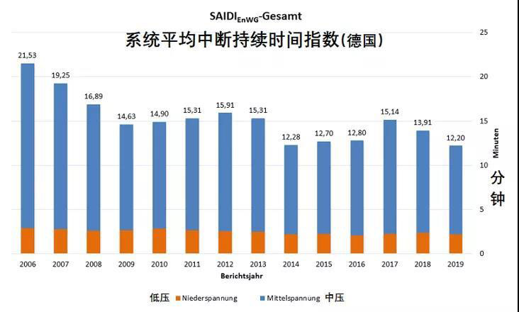 盡管近年來具有間歇性和不確定性的可再生能源發(fā)電比例一直在上升,德國仍然是世界上最可靠的電網(wǎng)之一,其電網(wǎng)安全穩(wěn)定性和供電可靠性都有一定的保障。根據(jù)德國聯(lián)邦網(wǎng)絡(luò)局(Federal Network Agency,Bundesnetzagentur)的數(shù)據(jù),2019年德國每個用戶的年平均停電時長為12.2分鐘,低于2019年的13.91分鐘,在整個歐洲及OECD國家中位列第二,僅次于瑞士,供電可靠率達(dá)到接近五個九的99.998%,綜合電壓合格率也極高。相比之下,其他歐盟國家如英國,法國和西班牙每年都有大約50分鐘的中斷。此外,根據(jù)美國能源信息署(EIA)的數(shù)據(jù),2019年美國的平均電力中斷事件為284分鐘(約4.7小時),即使除去山火,颶風(fēng)和嚴(yán)重暴風(fēng)氣候的影響,用戶的平均斷電時間也高達(dá)92分鐘,遠(yuǎn)遠(yuǎn)高于德國的水平。