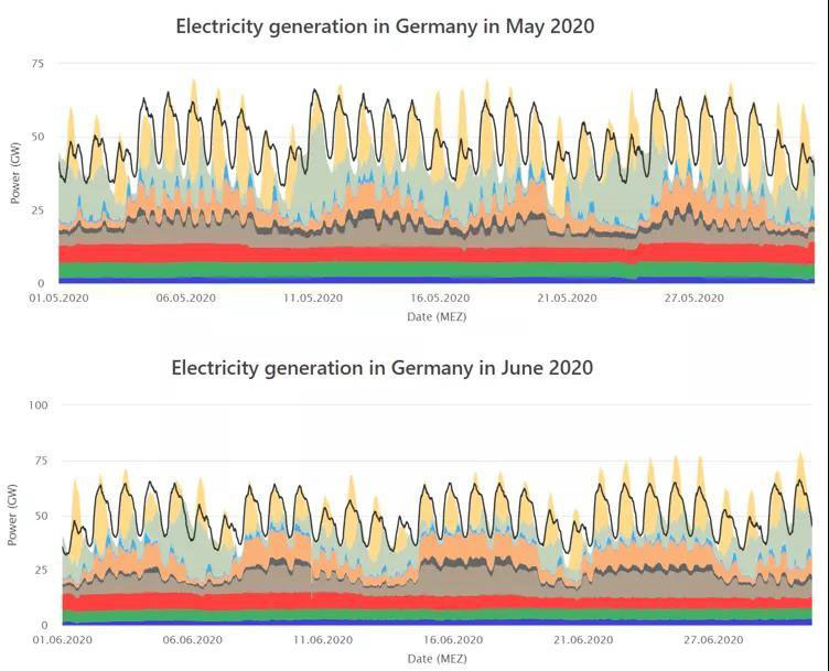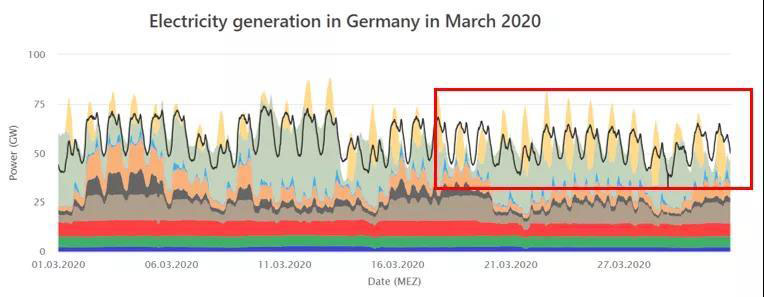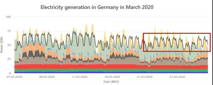 同時還可以看到,自五月大面積的封鎖開始后,德國每天的負(fù)荷曲線不再總是有明顯的出現(xiàn)在早晨和傍晚的兩個峰值,而形成了更多僅在午間達(dá)峰,早晚都偏低的負(fù)荷曲線形態(tài)。尤其是在五月,早晚與午間峰值的負(fù)荷差相較于二、三月更高,這都體現(xiàn)出了新冠封鎖和居家辦公帶來的人們生活、用電習(xí)慣的變化。