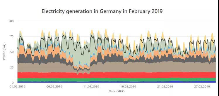 黑色曲線代表一個月內(nèi)的負(fù)荷曲線,不同顏色的色塊代表不同的發(fā)電源,由上至下:淺黃色為太陽能發(fā)電,淺綠色為海上風(fēng)電與陸上風(fēng)電之和,淺藍(lán)色則為抽水蓄能。接下來,橘黃色色塊為天然氣發(fā)電量,深、淺兩種棕色色塊則代表無煙煤與褐煤發(fā)電量之和。最底部構(gòu)成基礎(chǔ)負(fù)荷的則分別為核能(紅色),生物質(zhì)能(深綠色),及水力發(fā)電(深藍(lán)色)。下同。所有負(fù)荷曲線圖均來自Fraunhofer ISE研究所的Energy-Charts平臺。