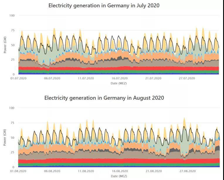 七、八月德國的光照資源仍十分優(yōu)越,由于總負(fù)荷還沒有回到正常范圍,許多天可再生能源與化石燃料發(fā)電量之和都超過了德國的總負(fù)荷量,得益于多年來發(fā)展的較好跨國電力通道建設(shè),多余的電力通過跨國輸電網(wǎng)出口至其他歐洲國家, 共同消納。