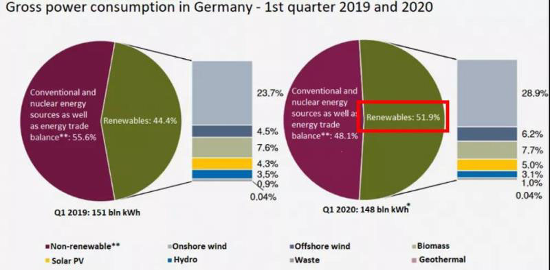 20年前,國家電網(wǎng)部分電力專家認(rèn)為電網(wǎng)中可再生能源占比超過百分之十,由于其波動性,電網(wǎng)就很大可能會崩潰?,F(xiàn)在,德國已經(jīng)證明了一季度內(nèi)52%的可再生能源供應(yīng)也是安全可靠的,且這是在完全沒有儲能裝置的情況下做到的。隨著各類電力系統(tǒng)靈活性資源的挖掘和支撐,未來德國電網(wǎng)80%甚至100%可再生能源電力系統(tǒng)指日可待。