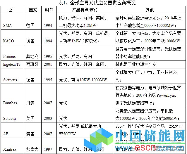 美國、日本也具有雄厚的工業(yè)基礎(chǔ)和先進(jìn)的半導(dǎo)體技術(shù),他們在電路結(jié)構(gòu)設(shè)計(jì)、電氣和自動(dòng)控制設(shè)計(jì)方面具有很強(qiáng)的實(shí)力,所以他們依靠公司的品牌在光伏逆變器生產(chǎn)設(shè)計(jì)方面也具有很強(qiáng)的實(shí)力和競爭優(yōu)勢。國外主要逆變器廠商有:SMA、KACO、Fronius、lngetearTi、Siemens、studer、xantrex、Danfoss、conergy、Power-one、OutbackPower、AE,Spwtick等公司,其中SMA、KACO、Fronius、lngeteam、Siemens占全球市場份額70%,逆變器的先行者德國SMA2009年市場占有率為44%,銷售額9.3億歐元,逆變器出貨量達(dá)3.4GW,2010年銷售額達(dá)到11億~l3億歐元,同比增長18%~40%。傳統(tǒng)光伏逆變器廠商紛紛擴(kuò)充產(chǎn)能,建設(shè)完善渠道,同時(shí)傳統(tǒng)電氣、自控等工業(yè)巨頭也加速進(jìn)入新能源逆變器市場。(注:表1和表2中的“時(shí)間”均指企業(yè)的成立時(shí)間)