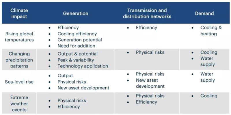 電力系統(tǒng)正面臨著越來越大的來自氣候變化的壓力。氣候變化導(dǎo)致全球溫度上升,降水不規(guī)律,海平面上升以及更頻繁或更強(qiáng)烈的極端天氣事件,這對(duì)電力安全具有重大影響。對(duì)于發(fā)電側(cè)而言,氣候變化會(huì)降低效率,并改變發(fā)電廠(包括火電和可再生能源發(fā)電設(shè)施)的可用性和發(fā)電潛力。氣候變化可能給輸配電系統(tǒng)帶來更高的損耗、變電容量改變以及特定的物理?yè)p害。在許多國(guó)家,可能還會(huì)增加制冷的電力需求,這將成為增加發(fā)電量的驅(qū)動(dòng)因素。