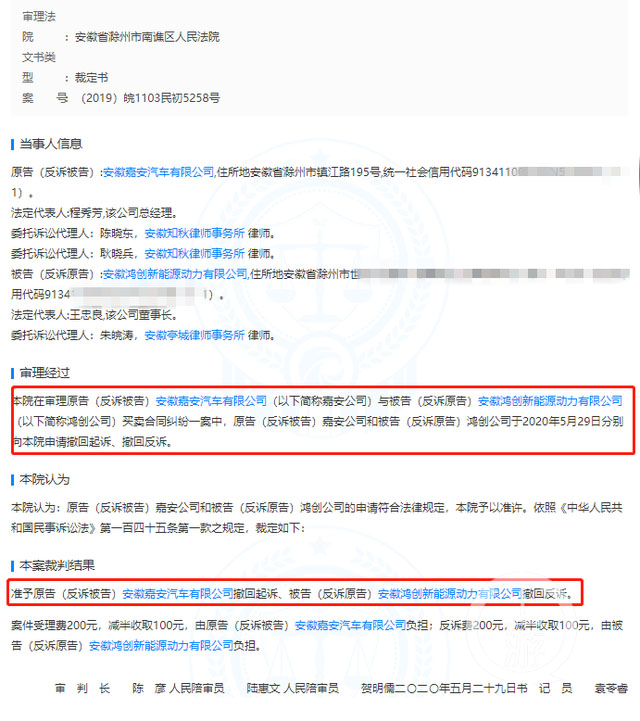 據(jù)2020年5月29日南譙區(qū)人民法院作出的(2019)皖1103民初5258號《民事裁定書》顯示,南譙區(qū)法院在審理原告(反訴被告)安徽嘉安汽車有限公司與被告(反訴原告)安徽鴻創(chuàng)新能源動力有限公司買賣合同糾紛一案中,嘉安公司和鴻創(chuàng)新能源于2020年5月29日分別向本院申請撤回起訴、撤回反訴。因此,南譙區(qū)法院作出準(zhǔn)許雙方撤訴的民事裁定。