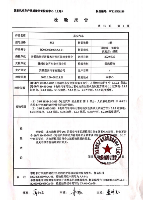 2020年8月28日,受安徽滁州經(jīng)濟技術(shù)開發(fā)區(qū)管理委員會委托,國家機動車產(chǎn)品質(zhì)量監(jiān)督檢驗中心(上海)出具了嘉安汽車《檢驗報告》。檢驗報告顯示,所檢項目除單體蓄電池擠壓、針刺不符合相關(guān)要求外,其余所檢測項目均符合相關(guān)標(biāo)準(zhǔn)。