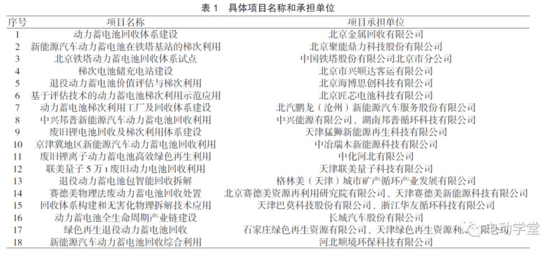 2019年7月,京津冀三地工業(yè)與信息化部門聯(lián)合發(fā)布了《關(guān)于公布京津冀地區(qū)新能源汽車動力電池回收利用試點(diǎn)示范項目名單的通知》,共有18個項目列入試點(diǎn)示范項目名單,具體項目名稱和承擔(dān)單位如表1所示。