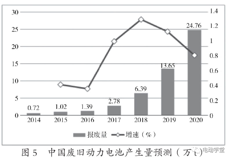 當(dāng)新能源汽車動力電池容量衰減至低于80%時,動力電池就無法滿足電動汽車的動力需求,動力電池就需要進(jìn)行報廢處置。一般動力電池的使用壽命為5~8年,這意味著動力電池往往先于新能源汽車的報廢。通常,人們根據(jù)新能源汽車銷售量增長幅度和趨勢、動力電池使用壽命來預(yù)測廢鋰離子電池產(chǎn)生量。中國產(chǎn)業(yè)信息網(wǎng)預(yù)測了中國廢舊動力電池回收的產(chǎn)生量,如圖5所示。從圖中可以看出,2019年退役動力電池為13.65萬t,2020年退役量為24.76萬t。
