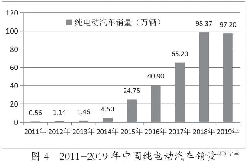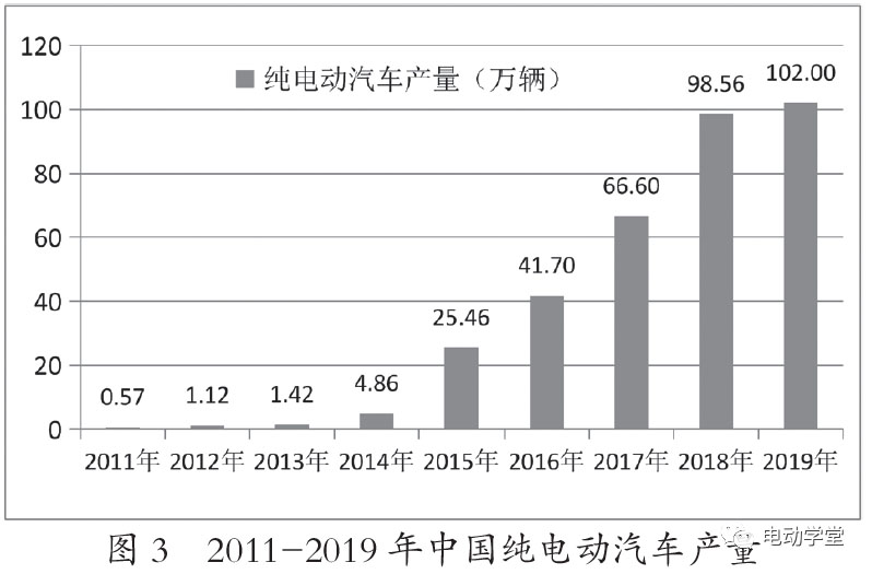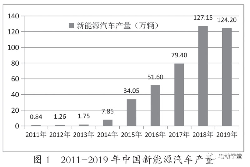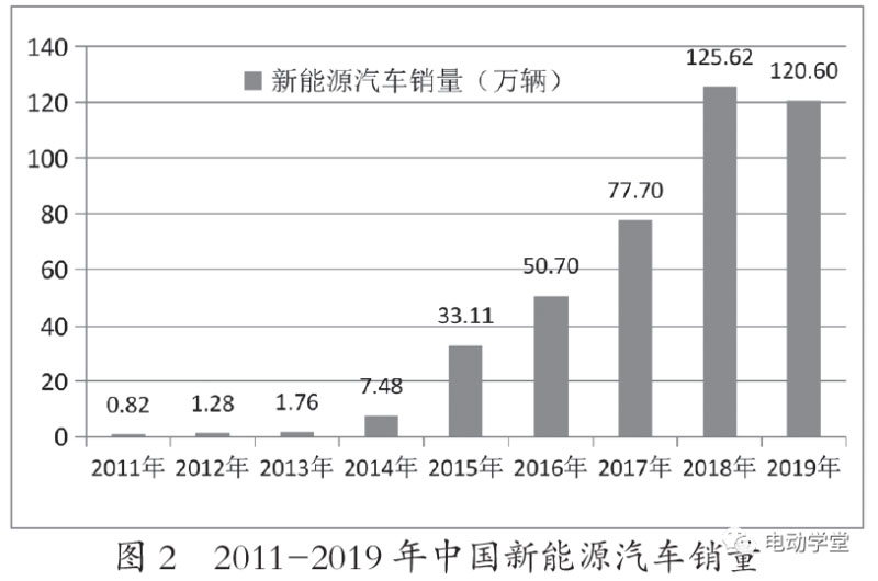 隨著國家對新能源汽車發(fā)展的大力支持和鼓勵,我國新能源汽車產(chǎn)量和新能源汽車銷量呈爆發(fā)式增長。截至2019年底,我國新能源汽車?yán)塾嫳S辛砍^390萬輛,占全球市場保有量的50%以上。2011-2019年中國新能源汽車產(chǎn)銷量情況如圖1和圖2所示。