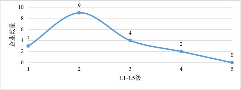從整體評(píng)級(jí)來(lái)看,18份有效調(diào)研樣本中,L5級(jí)企業(yè)0家,L4級(jí)企業(yè)2家,L3級(jí)企業(yè)4家,L2級(jí)企業(yè)9家,L1級(jí)企業(yè)3家。由于單項(xiàng)能力評(píng)分較低而降級(jí)的企業(yè)共3家,其中2家為L(zhǎng)3降至L2,1家為L(zhǎng)2降至L1,3家都因?yàn)閼?yīng)用層面分?jǐn)?shù)偏低而降級(jí)。