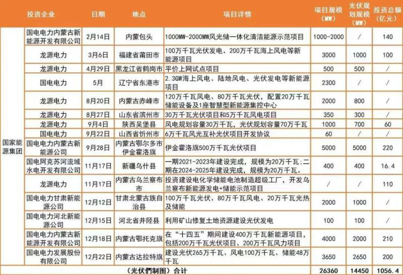 此外,2020年國家能源集團(tuán)共簽約15個(gè)新能源投資建設(shè)項(xiàng)目,投資總額超千億元,總規(guī)模超過26GW,其中光伏近15GW,占比過半。項(xiàng)目遍及內(nèi)蒙古、福建、黑龍江、遼寧、新疆、甘肅、山東、山西、河北、陜西等10個(gè)省/自治區(qū)。