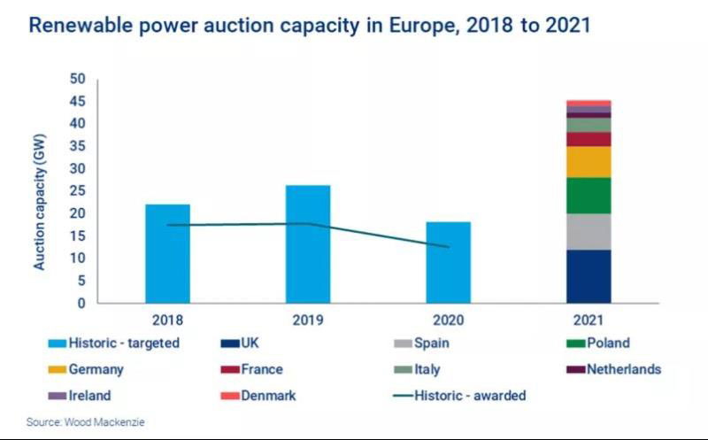 根據(jù)Wood Mackenzie最新的一項(xiàng)分析,2021年歐洲計(jì)劃競(jìng)標(biāo)的總?cè)萘扛哌_(dá)45GW,其中包括17GW的風(fēng)電,6GW的光伏發(fā)電,以及技術(shù)中立的或多種可再生能源混合技術(shù)。