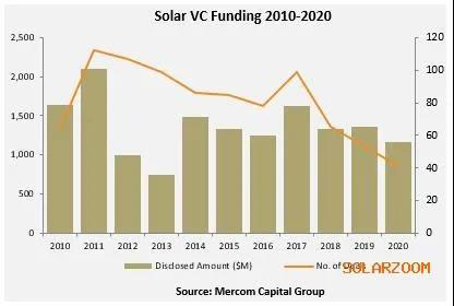 2020年,太陽能行業(yè)的全球風(fēng)險(xiǎn)投資和私募股權(quán)(VC/PE)達(dá)到41筆交易,累計(jì)規(guī)模12億美元,而2019年的53筆交易為14億美元。