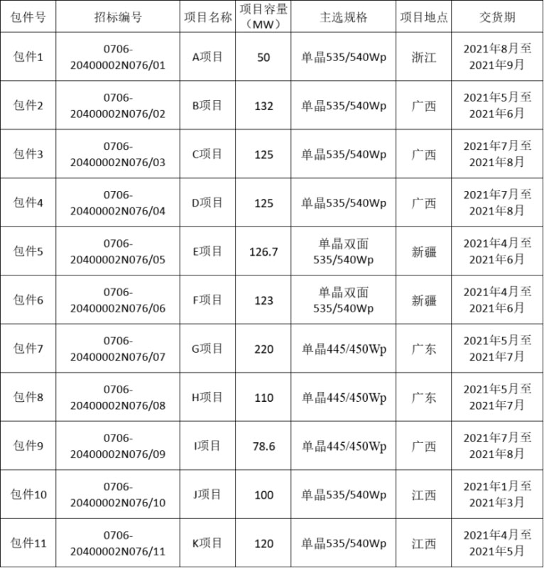 根據(jù)招標(biāo)公告,本次招標(biāo)共分為11個(gè)標(biāo)包,項(xiàng)目地點(diǎn)分布于浙江、廣西、新疆、廣東、江西五個(gè)省份,與去年不同的是,中核匯能此次集采明確了具體項(xiàng)目,這將給組件供貨能力以及組件報(bào)價(jià)提供更詳細(xì)的參考。