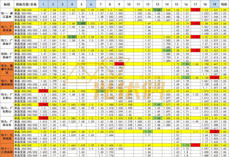 備注:標(biāo)黃方案為主選方案,其他為三個(gè)備選方案;投標(biāo)企業(yè)藍(lán)色為一線組件企業(yè);橙色標(biāo)段為630前供貨標(biāo)段