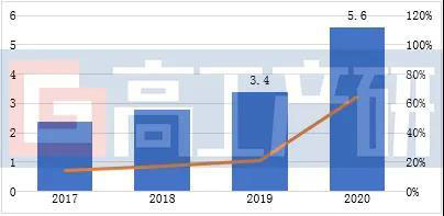 2017-2020年電動工具市場鋰電池出貨量規(guī)模及預測(GWh,%)