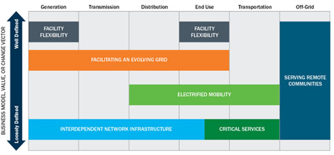ESGC用例描述了一組廣泛或相關(guān)的未來應(yīng)用,這些應(yīng)用通過性能更高、成本更低的能量存儲來啟用。圖1描繪了每個用例在電力系統(tǒng)中的位置以及預(yù)期收益易于量化或定義的程度。在此討論中,電力系統(tǒng)包括發(fā)電、輸電、配電、最終用途、運(yùn)輸、離網(wǎng)應(yīng)用6大部分,其中離網(wǎng)作為“服務(wù)遠(yuǎn)程社區(qū)”的一部分。
