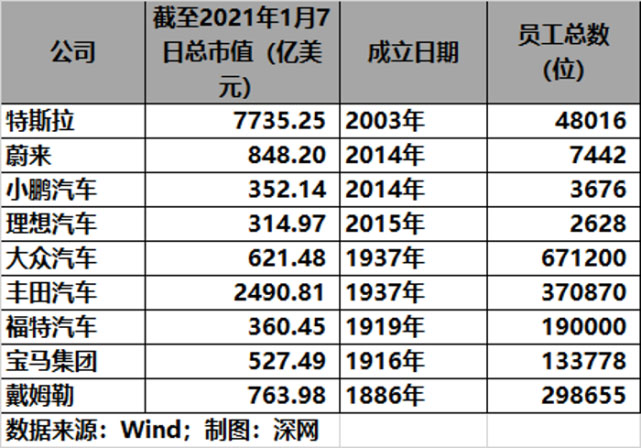 不僅是特斯拉,從國內(nèi)造車新勢力蔚來、小鵬、理想的市值來看,這些成立剛剛還不到10年的新能源車企的市值已經(jīng)有了超越百年車企的勢頭。1月12日,蔚來的總市值一度超過千億美元,超過了奔馳的母公司戴姆勒、寶馬、福特、大眾(奧迪母公司)等百年車企的市值。