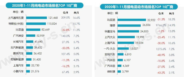 據(jù)乘聯(lián)會數(shù)據(jù)顯示,2020年前11個月,在純電動車市場,銷量排名前十公司主要除了特斯拉、蔚來、小鵬汽車外,主要集中在比亞迪、廣汽、北汽等汽車廠商,沒有大眾、寶馬、戴姆勒的身影;而在插電混動市場領域,理想及華晨寶馬、上海大眾、廣汽豐田等合資品牌的銷量占據(jù)了多半市場份額。