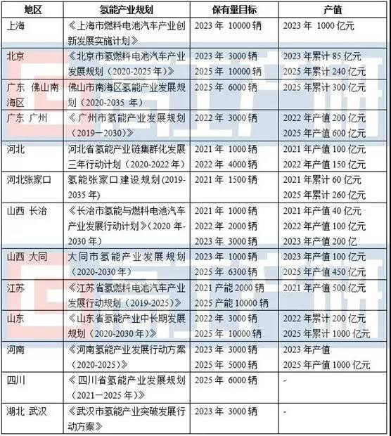 另據(jù)不完全統(tǒng)計,僅上海、北京、廣東、山西、山東、江蘇、河北、河南、四川、湖北等十個省份及直轄市明確規(guī)劃(如下圖所示),2023/2025年燃料電池汽車保有量分別達到3.5萬輛和7.63萬輛。2020年底國內燃料電池汽車保有量在8000輛左右,這意味著未來三年年均銷量需達到9000輛以上,未來五年年均銷量在13660輛以上。