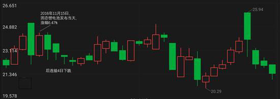 而早在2016年11月15日,國內(nèi)企業(yè)珈偉股份便發(fā)布了全球首例固態(tài)鋰電池,并在發(fā)布會現(xiàn)場向觀眾們展示了其研發(fā)的固態(tài)鋰電池在槍擊、針刺、剪斷后仍能放電,且不鼓脹不爆炸,安全性極高。發(fā)布會結(jié)束后,共有3家汽車公司與珈偉股份簽署了合作協(xié)議。當天,珈偉股份股價上漲6.47%,但隨后幾日持續(xù)下跌。