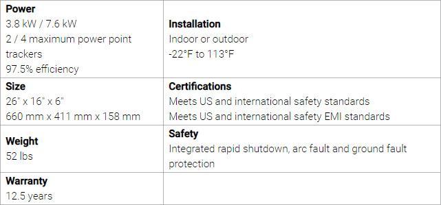 有新買家表示,新款逆變器已能夠與特斯拉的 Solar Roof 光伏裝置一起安裝,感興趣的朋友可訪問官方網(wǎng)站獲取詳情。以下是特斯拉列出的某些關(guān)鍵規(guī)格: