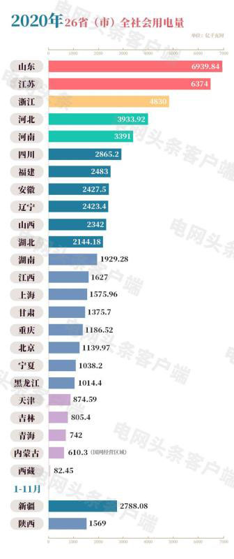 電力大數(shù)據(jù)帶您一圖看懂2020年26省全社會用電量。