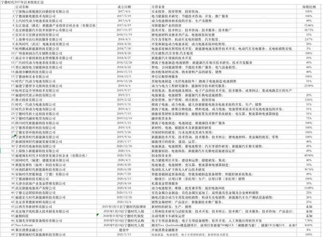 據(jù)21世紀(jì)經(jīng)濟(jì)報(bào)道記者不完全統(tǒng)計(jì),自2017年以來,寧德時(shí)代對外投資了49家企業(yè),涉及電池及相關(guān)研發(fā)制造、材料、儲能、技術(shù)推廣、投資、自動駕駛、服務(wù)和銷售公司等行業(yè)。