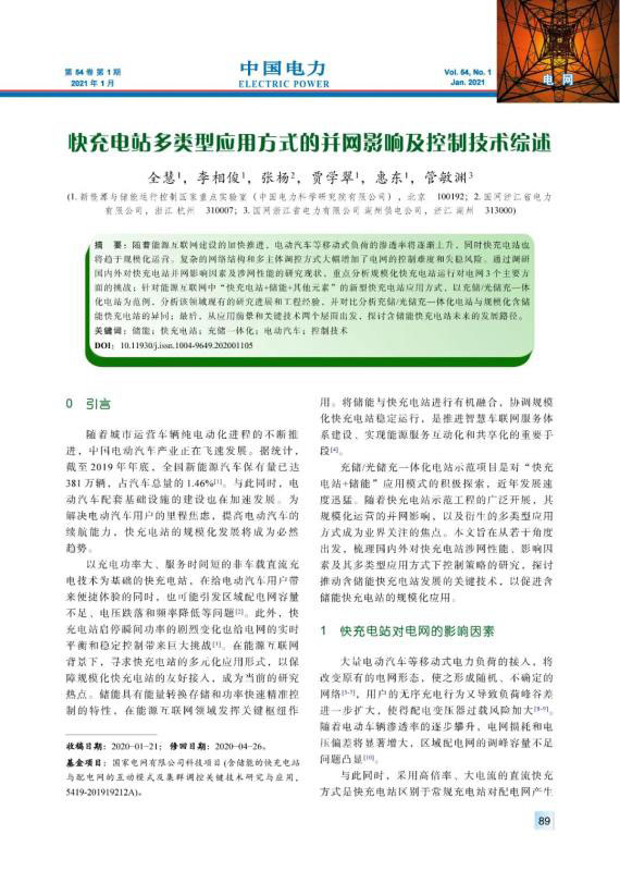 全慧, 李相俊, 張楊, 等. 快充電站多類型應(yīng)用方式的并網(wǎng)影響及控制技術(shù)綜述[J]. 中國電力, 2021, 54(1): 89-95, 103.