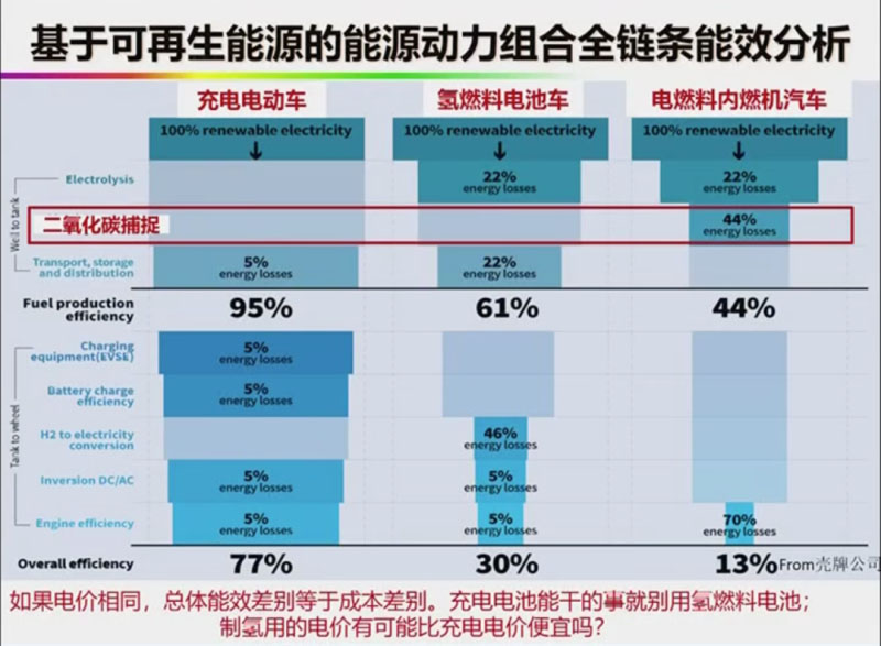 如果所有電力都來源于可再生能源,將電動(dòng)汽車、氫燃料電池汽車、綠色甲醇的內(nèi)燃機(jī)汽車進(jìn)行比較,全生命周期能源效率,還是電動(dòng)汽車最高。