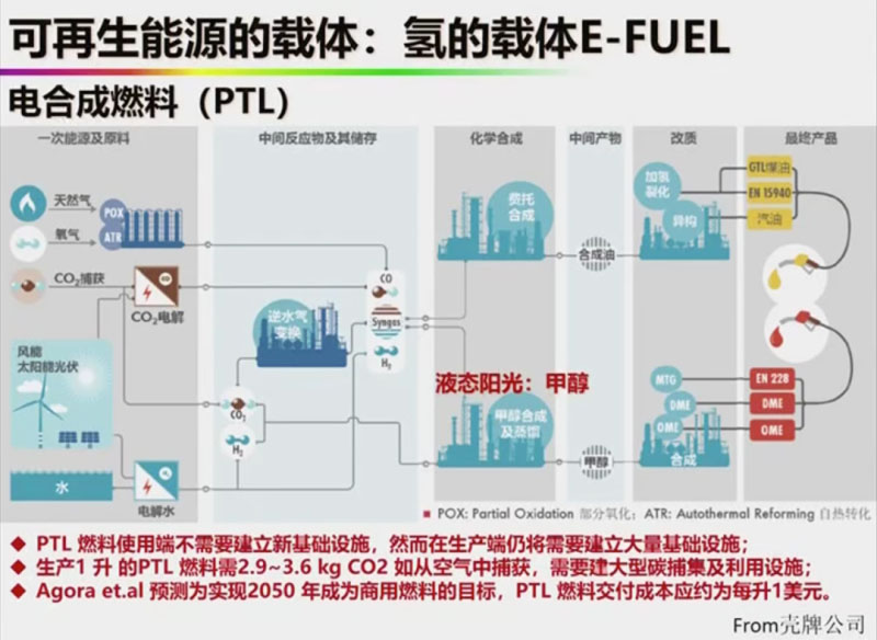 目前在很火的“液態(tài)陽光”,即“清潔甲醇”,利用光伏等可再生能源產(chǎn)生的電力電解水,制成氫,再補(bǔ)獲二氧化碳,生成甲醇,但捕獲二氧化碳成本很高,僅可用于飛機(jī)和遠(yuǎn)洋貨輪。
