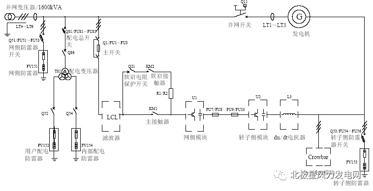 圖4為事故機(jī)組變頻器原理圖。箱變到變頻器的三相電纜接線是穿過塔基變頻器接地平臺(tái)的接線孔后,接到并網(wǎng)開關(guān)下端的三根銅排上,每根銅排(截面100×10)下方接有240mm2 多股銅芯電纜4根,中部接小銅排(截面40×5)到主開關(guān)Q1。并網(wǎng)開關(guān)上端的銅排連接發(fā)電機(jī)定子電纜。